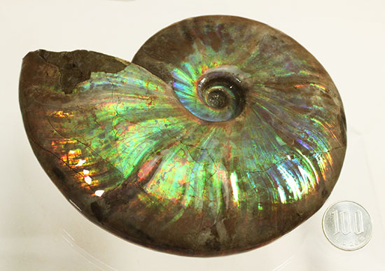 イリデッセンス(iridescence)はアンモナイトの殻の極薄の表層部分が保存された場合のみ楽しめる現象です。表層が見事に保存されていることが、この断面でもご覧いただけます。