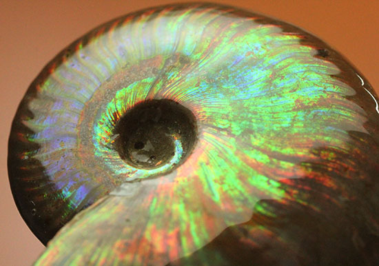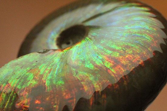 イリデッセンス(iridescence)アンモナイトをご覧になるときは、一度で良いですから、ぜひとも太陽光のもとで御覧ください。全方位から光が当たると、干渉色が最大限に引き出されます。