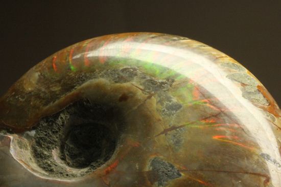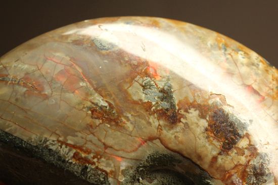 あまりみかけない配色、模様のアンモナイトです。乳白色が現れたかと思えば、茶色をベースにした色もあり、そこへ突如赤や緑の光りが差し込んでくるんです。この写真では、あれ、光ってない!とお思いになるでしょう?