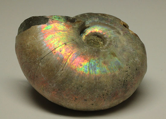 アンモナイト中で光るアンモナイトを「遊色アンモナイト」とよびます。これらはアンモナイト表面にアラゴナイトと呼ばれる層がくっついて化石化しています。アラゴナイトというのは鉱物の名前で、日本ではあられ石(霰石)ともいいます。主成分は炭酸カルシウムです。