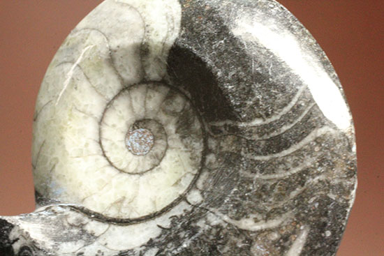 ホールタイプのゴニアタイトです。ゴニアタイトの特徴は、その単純さです。まだ複雑に変化していない縫合線は、独特のカーブを描き、そのシンプルさゆえに、幾何学的な模様を描き出します。