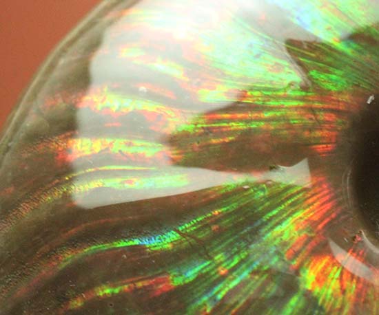 写真は?赤みが強く出ています。少しだけアンモナイトの角度を傾けると、一気にグリーンの配色が強くなったカラーが現れます。カメレオンのような早変わり。見ていて、飽きることがありません。