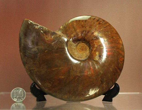 赤を中心にイリデッセンス(iridescence)を有します。イリデッセンス(iridescence)とは、光の干渉(かんしょう)により、アンモナイトの殻が様々な色に輝く現象のことです。この標本はほぼ赤一色という感じです。