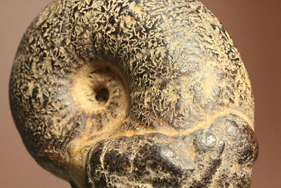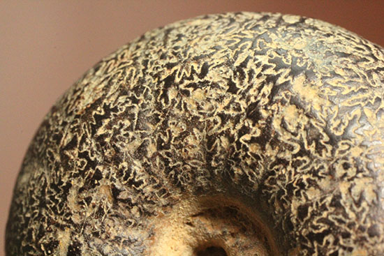 本標本の特徴は、これでもか、というほど緻密で繊細な縫合全模様にあります。ルーペで除きたくなるような細やかな曲線美がアンモナイト殻表面に見られます。