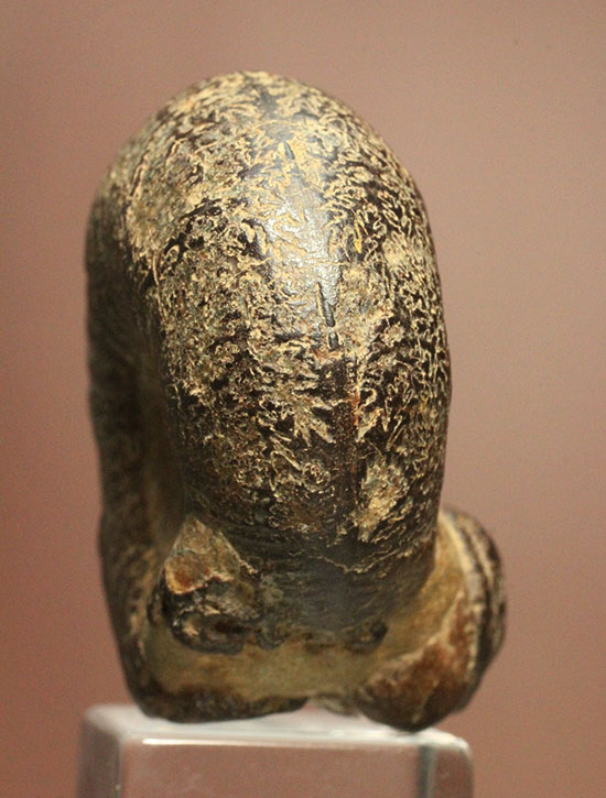 アンモナイトの殻を少し剥がすと、このように複雑でなんとも面白い模様が現れます。菊の葉に似ていることから、アンモナイトは日本や中国で別名『菊石』とよばれることも。この複雑怪奇な模様は、小部屋に仕切られた隔壁という部分と外殻が交わる線です。この線を縫合線と呼びます。