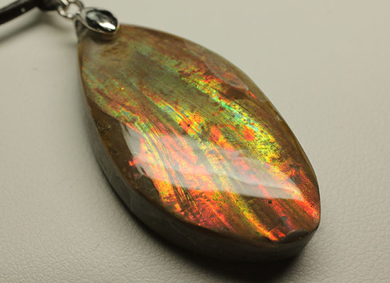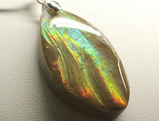 イリデッセンス(iridescence)を有するアンモナイトのシェルを使ったペンダントトップです。唯一無二の柄は化石ならでは。