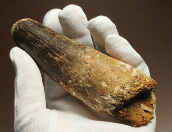 野太い!巨大恐竜スピノサウルスらしい、迫力の歯化石です。