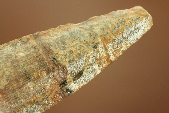 | 学名 | 根元へかけて一気に厚みが増します。太いスピノサウルスの歯化石(Spinosaurus) |
