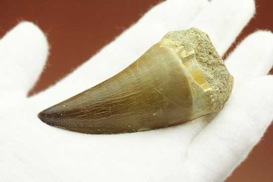 比較的多く歯の化石が出回っているが、偽造品(母岩に歯を埋め込んだものが多い)も出回っているため注意が必要です。また、出土・保存状態によって品質はさまざまです。表面がエナメル質を保ち、かつルート(根元)が太いモササウルスの歯化石は意外に数が少なく価値が高いと言われています。