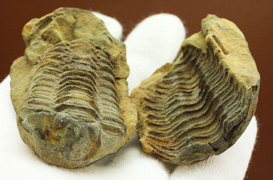 ノジュール化石(丸い泥岩化石)を割ると、ご覧のような三葉虫が出てきます。