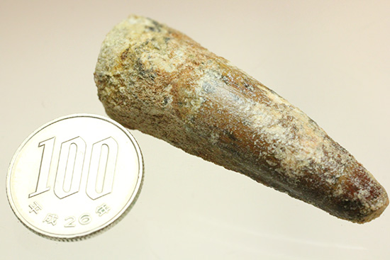 ロングカーブ計測5.8センチ。スピノサウルス歯化石をご紹介します。エナメル質がよく残っています。