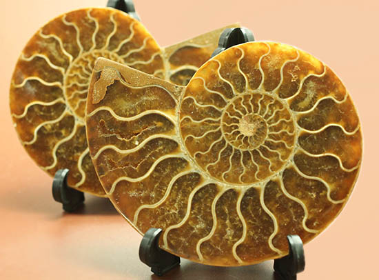 新着アイテム これぞコレクティブアイテム。素晴らしい保存状態のアンモナイトのスライスカットペア標本。隔壁の形にご注目。