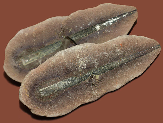 米国イリノイ州マゾン(メゾン)クリーク産のリンボクの仲間と思しき植物の葉のネガポジ化石をアップしました。