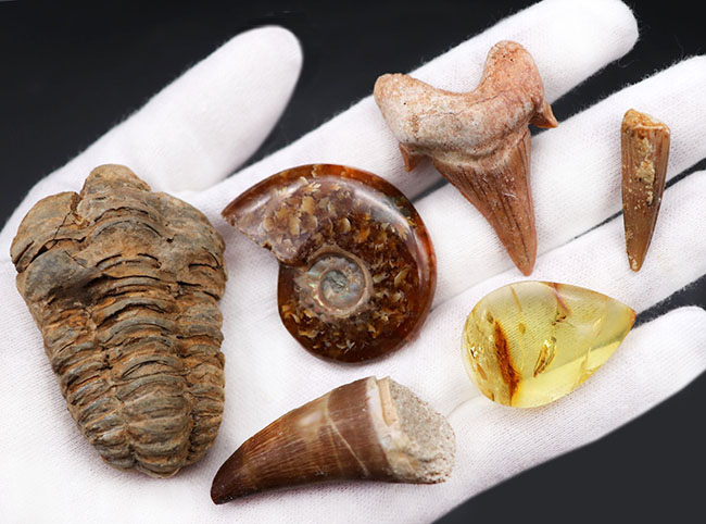 新着アイテム 2020年バージョン!化石セブンが恐竜や化石が大好きなお子さんのために考案したクリスマスプレゼントにぴったりの化石コレクションセット。ラッピング無料!大きなサイズの縫合線アンモナイトや肉食恐竜歯化石、琥珀、三葉虫など人気化石を含む、本物化石バラエティ6点セット。
