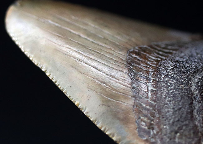 オールナチュラルのメガロドン(Carcharocles megalodon)歯化石をアップしました。セレーションもよく保存されています。