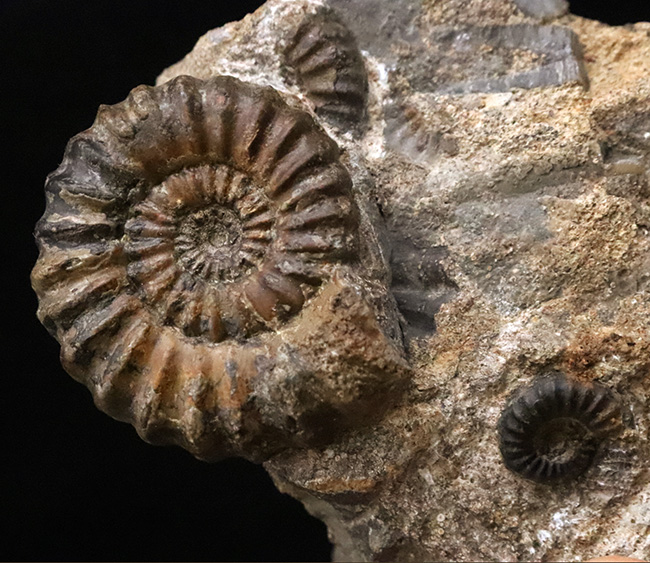 新着アイテム 特徴的な肋(リブ)が保存された、ジュラ紀中期の珍しいアンモナイト、マクロセファリテス(Macrocephalites)の化石