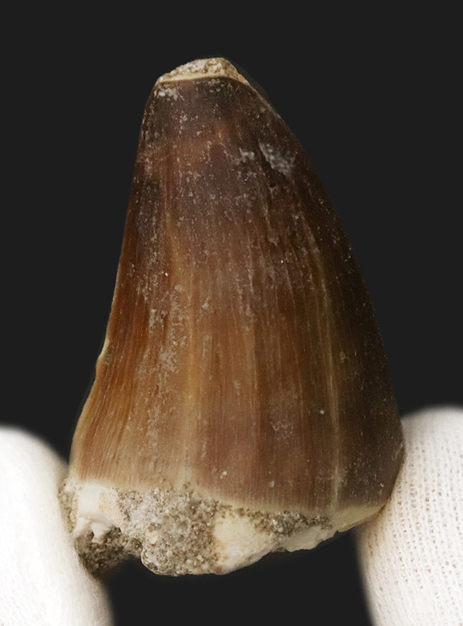 ミドルセクションが特に分厚い、極太の標本!白亜紀後期の海の王者、モササウルス(Mosasaurus)の歯化石をアップしました。