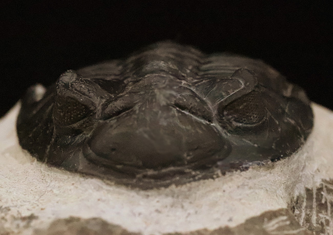 レンズまで保存された大きな複眼、特徴的な長い頬棘、これまた特徴的な尾部の側棘など、ほぼ完璧に保存された、非常に上質のホラルドプス(Hollardops)をアップしました。