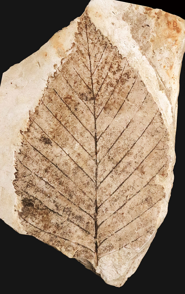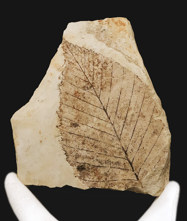新着アイテム 岩手県雫石産、輪郭・葉脈・鋸歯が極めて明瞭に保存された、中新世・10センチ級の大型ニレ科木の葉化石