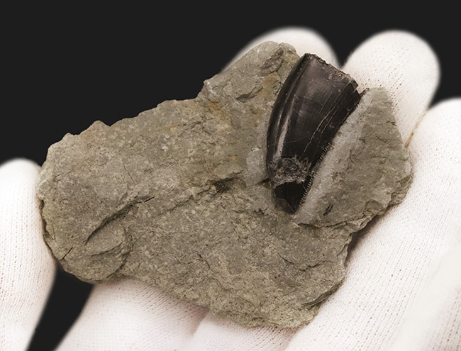 新着アイテム 獣脚類化石コレクターのマストアイテム!モリソンブラックをまとった、極めて美しい、アロサウルス・フラギリス(Allosaurus fragilis)の母岩付き歯化石