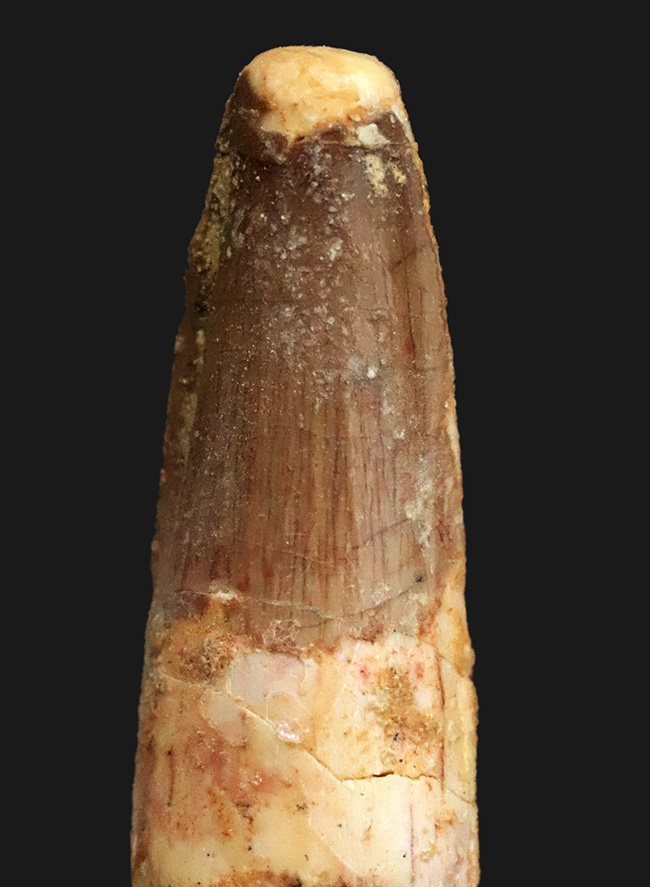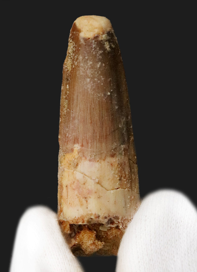 エナメル質に美しい光沢あり、北アフリカ・モロッコの白亜紀層から採集された、スピノサウルス(Spinosaurus)の歯化石をアップしました。