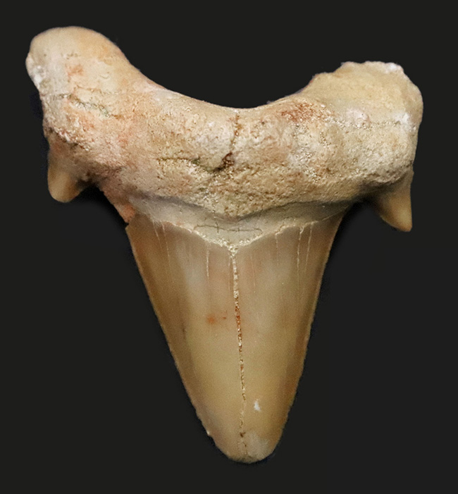 新着アイテム 力強い歯根、美しいエナメル質に加えて、副咬頭まで保存された上質のオトドゥス(Otodus)の歯化石