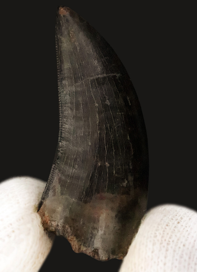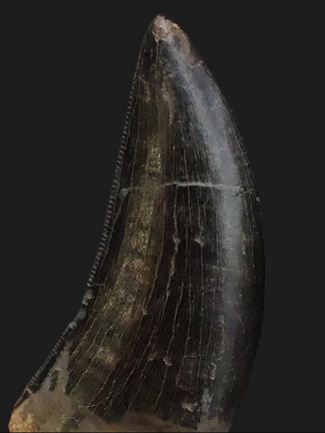 トップクオリティ!黒褐色のエナメル質が美しく輝く、見事な保存状態を誇るティラノサウルス・レックス(Tyrannosaurus rex)幼体の歯化石をアップしました。