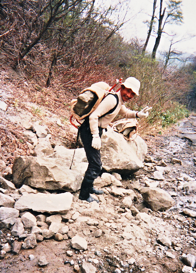 結局写真のような直立姿勢で歩けたのは10分程度、後は背負った重さで次第に前かがみになり、最後には牛馬のように背に負ったまま四つばいで一時間近くかけてはって車にたどり着きました。