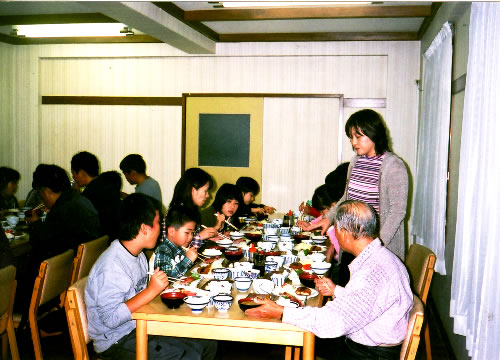宿の金沢ユースホステル着、全員で楽しい夕食のひと時