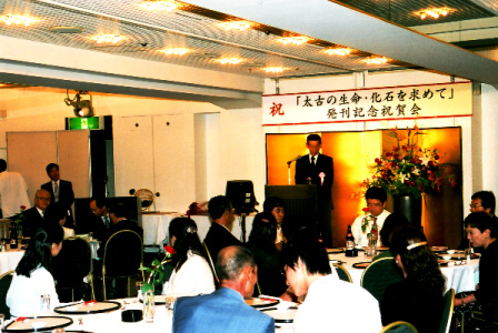 祝賀会当日のお客様はお世話なった先生方や化石仲間、父や妹、親戚やふるさとのご近所の皆様、化石展で知り合った化石に興味をいだく子供たちと保護者の皆様など、100名近くで賑やかに執り行われました。司会は当研究会会友の元・四国放送アナウンサーの藪田ひとみさん、開会の言葉は会員の和田氏、そして須鎗先生、両角先生、坂東氏に祝辞を頂き、徳島新聞社政治部長 新居基昭氏に乾杯音頭、会員の横山氏に万歳三唱など頂きました。そして私の挨拶では、それまでの苦労話や応援を頂いた方々、私に想いを託し先に旅立った恩師、久米先生や化石友人の高木さん、内縁の愛妻ヒサエさんなどのお身内を来賓として前にし、思い出が蘇えり涙ながらの挨拶となりました。