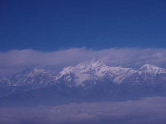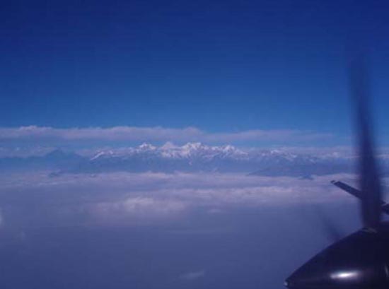 ポカラに向かう飛行機からのアンナプルナ連峰空港からは、バスで 5~6 分で、16 時半頃ポカラグランドホテルに到着した。ホテルは見栄えのする立派なホテルである。このホテルからは、天気がよければアンナプルナ連峰やマチャプチャレが見えるそうであるが、生憎雲がかかっており、見えなかった。