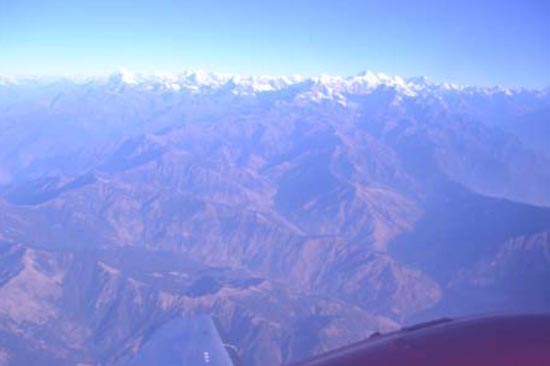 白く雪に覆われた山々が見え、バシャバシャとカメラのシャッターを押しているのであるが、うまく撮れているかはわからない。あとで確認すると焦点が合っていない写真が多い。乗客全員が撮り終わるまでエベレスト周辺を旋回し、帰途についた。乗客の興奮も収まったころ、アテンダントは、「空からみたエベレスト」という本を売りに来た。英語版であるがDVD も付いていたので購入した。20 ドルである。飛行機を降りると、機長がにっこり微笑んでこの本にサインをしてくれた。サービスも良いようである。
