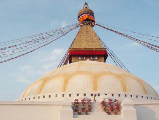 この後、チベット仏教の聖地であるボウダナートストパ寺院を訪れた。ここも目玉寺であるが、スワヤンブナートよりも大きい。寺の表面は、よくネパール仏教の紹介に出てくる目玉を表現した寺院で、寺院の尖塔から万国旗がなびいていた。途中から、寺の屋上に登ることができ、ここを歩いて一周できる。ちょうど夕陽が沈むところで、落ち着いた光景が広がっていた。