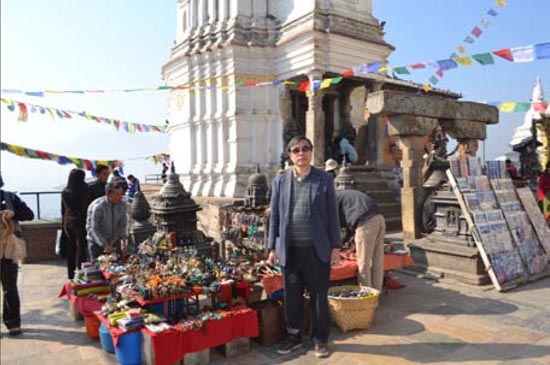 スワヤンブナートは、カトマンドゥ市内から少し離れた丘の中腹にあった。バスを降りて寺院に向かう坂を登っていくと丘の頂上付近に尖塔を持つ目玉模様の建物が目に入った。周りには、黒ずんだ石塔がとり囲んでいた。お土産屋さんの数も多い。 スワヤンブナートの土産物屋さんで、化石を眺めていると、店内にまだ色々な種類の化石が沢山あるので見ていかないかと誘ってくる。中が金色のアンモナイト1個(後で黄鉄鉱と判明)と形の細長く関節模様の化石2個を1000 ルピーで購入した。(なお、この関節模様の化石は、後日、オルソセラスであることが判明した。)