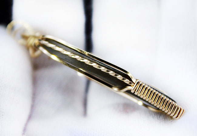 このアイテムのもう一つの特徴はジュエリー職人の腕の見せ所と言える金属部の加工。素材は925シルバー、真鍮の上に14金を厚くコーティングしたもの。いわゆるゴールドフィルド。ゴールドフィルドとは金メッキとは違います。金メッキは非常に薄く塗りつけたものですが、ゴールドフィルドはその10倍以上の厚みがあるものを指します。長期間使用しても、金が剥げないという特徴があります。