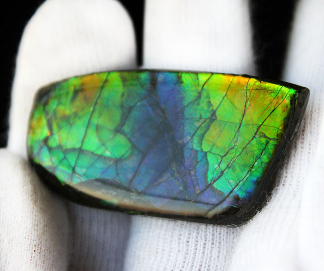 | 学名 | 希少色の青を見ることができる高品位のアンモライト(Ammolite)のピースの化石。見る角度によって色合いが変化する高品位化石。 |