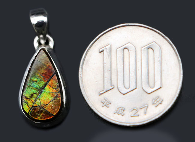 100円玉との比較。ペンダントトップとしては定番のドロップ型に整えられたアンモライトです。