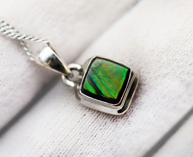 夏にかけてぴったり!明るい緑!数少ない生物起源の宝石の一つ、アンモライト(Ammolite)を使ったペンダントトップ(シルバーチェーン、革紐、高級ジュエリケース付き)/【al294】