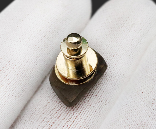 こちらは宝石、アンモナイトの原石を用いたピンブローチです。アンモライトはカナダ・ロッキー山脈東側斜面でのみ採掘される、希少な宝石で、もともとはプラセンチセラスというアンモナイトの殻です。数千万年という途方も無い時を経て、宝石へと変化しました。