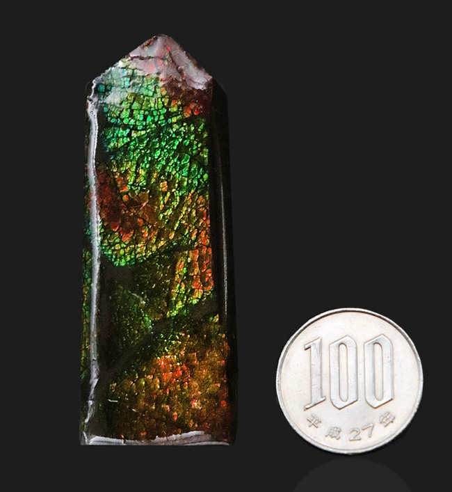 100円玉との比較。グリーンとオレンジを楽しめる、カナダ・アルバータ州で採集された宝石、アンモライトのピースです。
