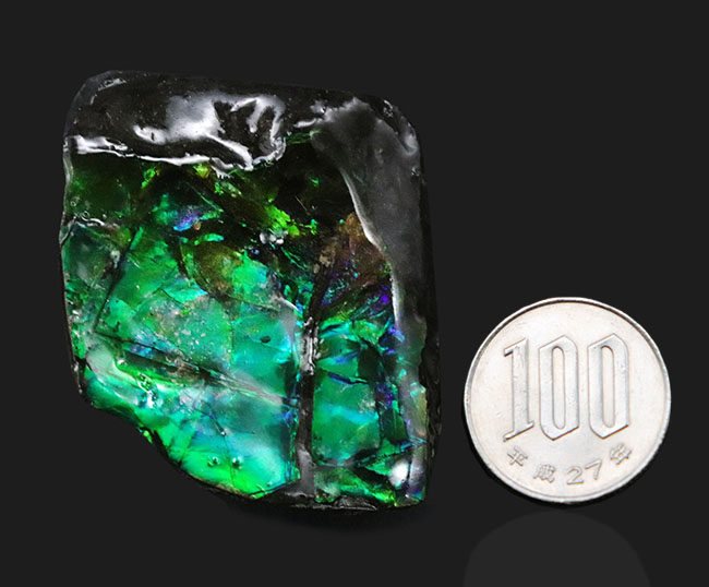 約45ミリの、まばゆいばかりに輝くグリーンのアンモライトのピースです。