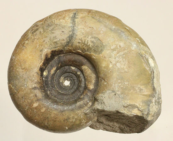 最も外側の太い一巻きは、一部縫合線も見られますね。気房を仕切る隔壁が、殻表面に接する際、織り込むようにしてできるのが縫合線模様です。菊葉模様がアンモナイトの種類を同定する際に重要になってきます。我々で言うところのID、指紋のようなものでしょうか!?縫合線模様は、表層のごくごく薄い膜を剥がしたところに位置します。指で触れると、その薄さに驚かれることと思います。