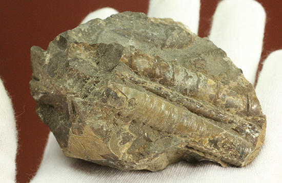 手の平サイズの、コンパクト標本。本体部分は直線距離で4.5センチあり、母岩サイズは幅7.4センチです。