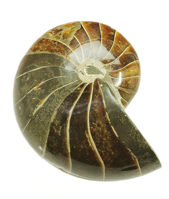 | 学名 | 835gのヘビー級のオウムガイの化石。シックで味わいぶかい色合いにご注目ください。 |