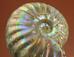 なぜアンモナイトがこのような輝きをみせるのでしょう?それは、殻表層にある、キチン質呼ばれる層と、アラゴナイトと呼ばれる層が交互に重なっていることに起因します。2つの異なる層に光が通ると、その層はそれぞれ光を屈折させます。厚さが異なる薄い層が交互に重なっている多重構造がバラエティに富む色を生み出すんですね。