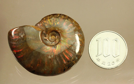 殻表面が赤い炎のような色を呈します。こちらのアンモナイトは正常巻きの中でも、いわゆる「密巻き」といって、中心部は幅の狭いキツい巻きをしており、巻きが外側へいくにつれて急激に幅広くなっていくタイプです。正常巻きの中には他に「ゆる巻き」があります。詳しくは、コラム『正常巻きアンモナイトの巻き方 ~密巻きとゆる巻き~』をご覧ください。