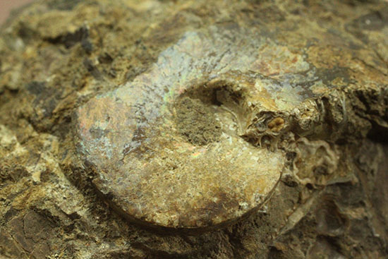 アンモナイトの殻の極薄層が保存されている証拠。北海道アンモナイトのなかでは極めて珍しい現象。