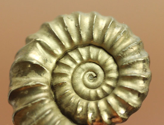 この渋い黄金色は、化石コレクターにはおなじみの黄鉄鉱。悠久の堆積期間を経て、アンモナイトの殻の本来の成分に取って代わりました。