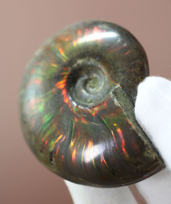 密巻きアンモナイト。最も太い外側の一巻きが、幅広く遊色します。