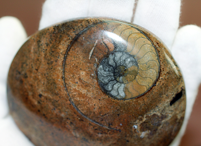 アンモナイト本体は直径4.5センチサイズあります。波のようにアンモナイトを横に仕切る線は、浮力を担う気房(きぼう)部分に見られる隔壁(かくへき)と言われる仕切り線です。